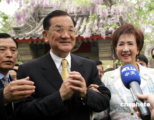 二零零五年四月二十九日,中国国民党主席连战在北京大学演讲后,携夫人参观母亲赵兰坤当年在燕京大学就读时曾住过的静园六院中的一院。图为连战在院外接受记者采访时高度称赞北大学子。作者:武仲林