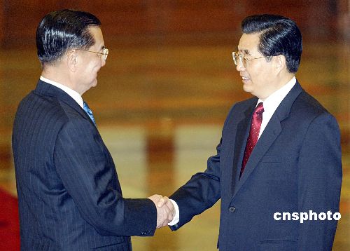 四月二十九日,中共中央总书记胡锦涛在北京人民大会堂会见中国国民党主席连战。作者:廖文静