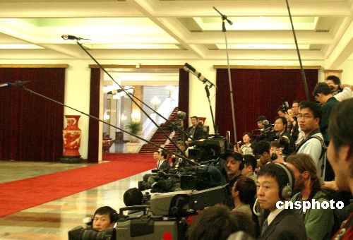 四月二十九日下午,中共中央总书记胡锦涛在北京会见中国国民党主席连战。大批海内外媒体记者云集人民大会堂见证这一历史时刻。作者:廖文静