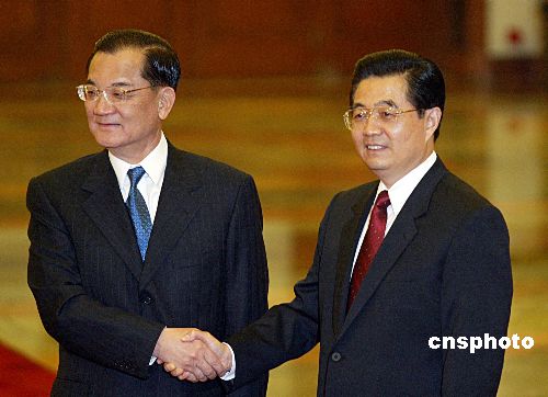 其时,两位领导人同着深色西服,胡锦涛系红色领带,连战系蓝色领带。