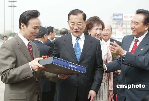 四月三十日,中国国民党主席连战结束北京之行启程前往西安,中共中央台办主任陈云林、北京市委副书记龙新民在机场为其送行。图为连战获赠北京之行纪念像册分外惊喜。作者:廖文静