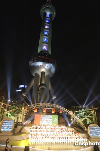 开幕式会场借助东方明珠塔十一个圆球与乒乓球十一分计分制的天然巧合,体现了“大珠小珠落玉盘”的美好意境。仪式结束后,一千一百八十名演员参与的《乒坛畅想》庆典文艺演出,用歌舞、武术、杂技、乒乓球表演的形式,充分展示了中国特色、上海特色和乒乓特征。