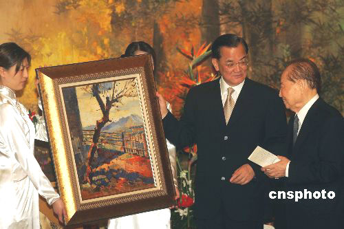 连战向汪道涵转交辜振甫当年的画作《阳明山庄》。作者:毛建军