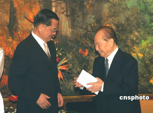 中国国民党主席连战今日(2日)上午,在上海锦江饭店小礼堂与海协会会长汪道涵会面。