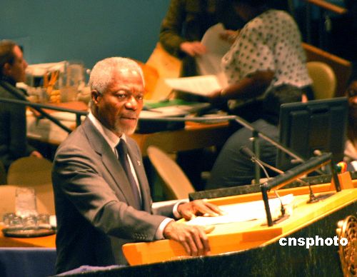 当地时间五月二日,《不扩散核武器条约》二○○五年审议大会在纽约联合国总部召开,联合国秘书长安南到会致词。作者:谭宏伟