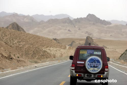 中新网5月3日电 二零零五年五月三日,穿越可可西里联想锋行探险队车队抵达北京——拉萨的109国道2500公里处。