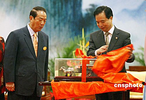 五月五日,中共陕西省委书记李建国在西安会见亲民党主席宋楚瑜,并赠送铜车马作为礼物。作者:廖文静
