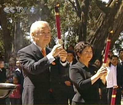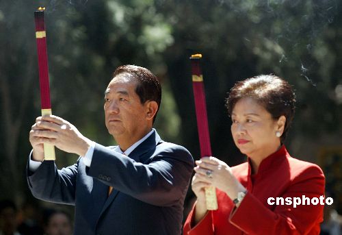 中新网5月6日电 亲民党主席宋楚瑜、陈万水夫妇今日(6日)上午,携亲民党大陆访问团一行在黄帝陵冢前上香祭拜。