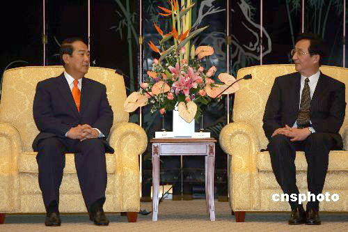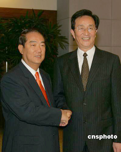 五月七日晚,中共中央政治局委员、上海市委书记陈良宇在上海科技馆会见了亲民党主席宋楚瑜率领的亲民党大陆访问团一行。作者:潘索菲