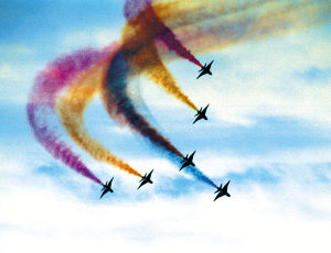 赤橙黄绿青蓝紫,谁持彩练当空舞?新型表演机为在蓝天织就更美的彩练,还专门加装了拉烟控制盒。此前,拉烟系统都是经过改装而成的。说起拉烟技术,在20世纪80年代初期,仅有美国和苏联少数国家具备,但它们实行技术封锁。为了打破这种局面,表演队经过上千次试验,先后攻克白烟、彩烟难题,终于达到世界先进水平。