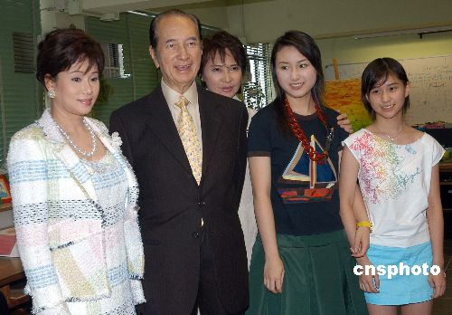 5月11日,港澳知名人仕何鸿燊博士与其三太何陈婉珍及两名女儿在香港出席护苗基金会《护苗初中教育课程》首映会,护苗基金会会长萧芳芳(中)并与何鸿燊一家四口合照。作者:邓庆乐