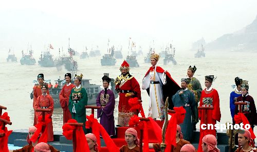 郑和开洋节仪式五月十六日在郑和船队当年出海和返回必经的闽江口长乐郑和广场隆重举行,江面波澜壮阔,人物栩栩如生,海船千帆竟发,再现了六百年前郑和下西洋的壮观场面。作者:蒋振江