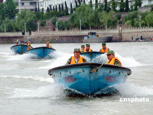 随着钱塘江支流--兰江进入了主汛期,5月17日下午,浙江省兰溪市2005年水上堤防抗洪抢险演习在兰江马公嘴城防大堤上举行。100余名防汛机动抢险队员进行了滑坡抢险和水上救护模拟险情演习,从而检验了防汛预警机制的有效性。作者:胡肖飞