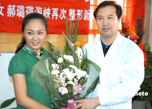 号称“中国第一人造美女”的郝璐璐,五月十九日在福州某美容医院将鲜花献给即日将为她实施前臂、大小腿减脂术的该院主治医生。作者:刘可耕