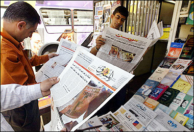 5月21日的《阿拉伯每日新闻》在头版刊登了一副萨达姆的狱中照片,图片上萨达姆在洗衣服。图为伊拉克人在报亭阅读该报。 春风