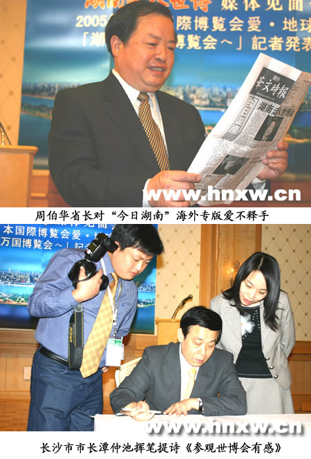 5月20日上午十点,在名古屋市举行的2005年爱知世博会“湖南走入世博”媒体见面会上,湖南省省长周伯华看到“今日湖南”海外专版样报时爱不释手,他说:“我在世博会中国馆馆日时就看到了这个专版,特别高兴,这个海外专版办得很好。”周伯华省长还高兴地手捧“今日湖南”海外专版样报在“湖南走入世博”媒体见面会的会标前让记者摄影拍照留念。