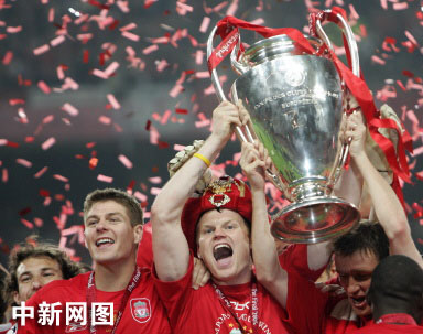 利物浦的后卫里瑟(中)手捧奖杯,旁边是队长杰拉德(左)。利物浦在5月25结束的欧洲冠军杯联赛点球击败AC米兰,最终比分6:5。