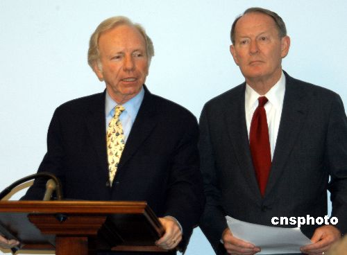 曾在去年竞选总统的美国参议员利伯曼(左)与另一名参议员亚历山大(右),25日联合提出旨在促进美中交流的“美中文化接触法案”议案。他呼吁在国际事务中视中国为盟友,在商业活动中待中国为伙伴,加强与中国的接触和交流,美国才会拥有灿烂的未来。作者:余东晖
