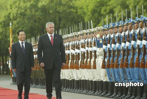 五月二十六日,中国国务院总理温家宝在北京举行仪式欢迎克罗地亚总理萨纳戴尔访华。作者:史利