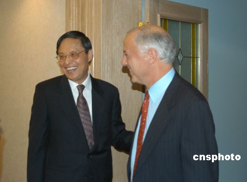 中国新任驻美大使周文重美东时间5月26日在华盛顿举行到任招待会。这是他在迎接客人时,与新任美中关系全国委员会主席奥林斯轻松交谈。作者:余东晖