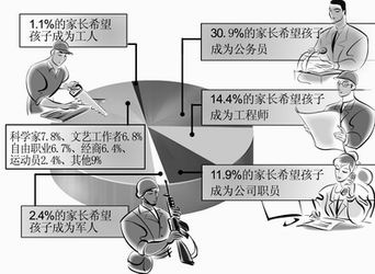 中新网5月30日电 据新民晚报报道,你希望孩子将来做什么?近三分之一的家长选择了公务员,只有1.1%的家长希望孩子成为工人。日前由市质量协会用户评价中心发布的《上海中小学生成长质量调查报告》揭示了当前家庭教育中存在的不少问题。