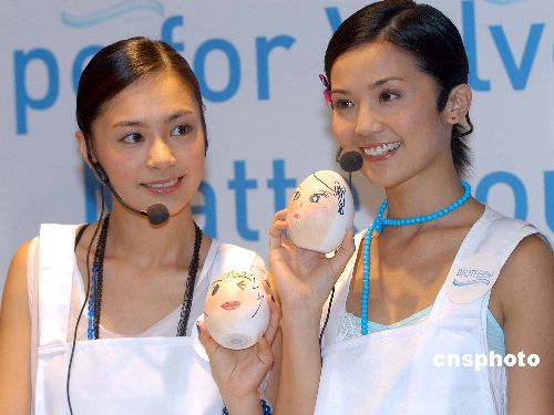 人气偶像Twins 5月31日在香港出席代言化妆品牌BIOTHERM宣传活动,Twins在活动上模拟在人的蛋脸上示范使用全新粉底,再画上可爱的人像,以宣传品牌新产品。作者:邓庆乐
