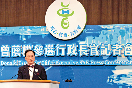 他透过面前密集的媒体大阵仗,向香港市民正式宣布参加中华人民共和国香港特别行政区行政长官选举,同时公布他的施政纲领。