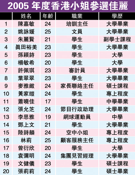 中新网6月7日电 据香港媒体报道,《2005年度香港小姐竞选》二十位候选佳丽将于下周一起程到南亚海啸灾区探访,昨日一班佳丽经过大会连日来“改头换面”,首次正式会见传媒。今届参选的佳丽学历俱十分高,大部分佳丽皆拥有大学程度,其中9号麦雅致、19号文健仪和20号张莉莉更持有硕士学位。不过佳丽们的平均年龄亦直线上升,有九位佳丽年龄更在24岁以上,接近参选的年龄上限。