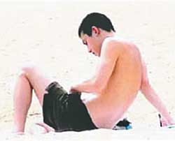 讲完电话,他又做了快40分钟的日光浴,才突然坐起身,出人意表地拉开短裤公然抓痒,可能是被蚂蚁偷袭的关系。这一幕煽情又暧昧的画面,就在海滩上活生生地上演,全被该媒体的狗仔队给拍到了,让陈冠希今年受人瞩目的丑事,活生生再添一桩。