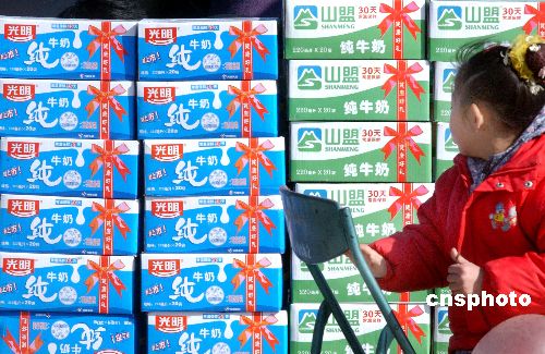 河南媒体近日报道了郑州光明山盟乳业有限公司“变质光明牛奶返厂加工再销售”一事。对此,郑州光明山盟的控股方——光明乳业股份有限公司当日发布了“诚告消费者书”,称“郑州光明山盟从来没有做过‘将变质牛奶返厂加工再销售’的行为”,但也坦承光明在管理上存在疏漏。图为2005年3月13日郑州街头促销的光明纯牛奶和光明山盟纯牛奶。作者:马健