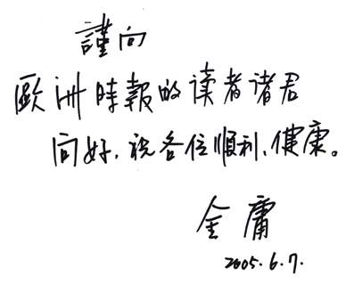 在见面会后,金庸欣然接受了欧洲时报的专访,并给该报报题词向读者问好:“谨向欧洲时报的读者诸君问好,祝各位顺利、健康。”