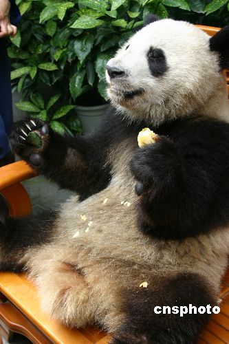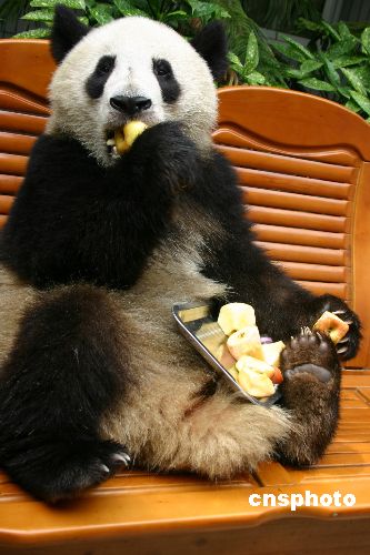 成都熊猫吃“苹果粽子”过端午