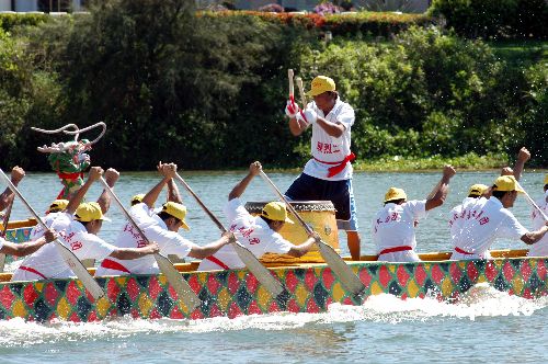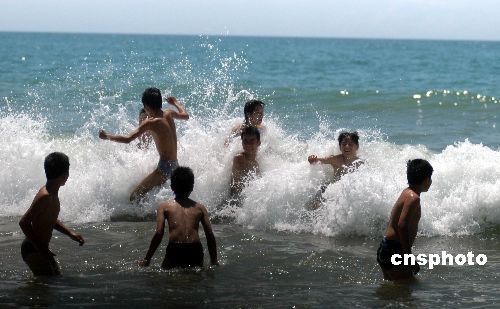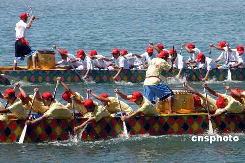 6月11日,海南博鳌16支龙舟队冒着烈日在万泉河入海口举行精彩激烈的龙舟大赛,庆祝传统佳节端午节。在博鳌海滨,不少村民携儿带女下海游泳,在端午节这一天俗称洗龙水祈平安。作者:蒙钟德