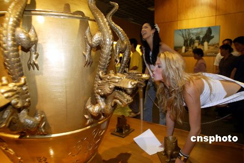 六月十一日,参加二零零五国际旅游小姐冠军总决赛的来自七十五个国家和地区的佳丽,来到河南省郑州市,开始河南巡游之旅,畅游美丽中原,感受黄河风情,体验悠久历史。图为郑州河南博物院根据历史记载复原的地动仪吸引参赛佳丽。作者:盛佳鹏