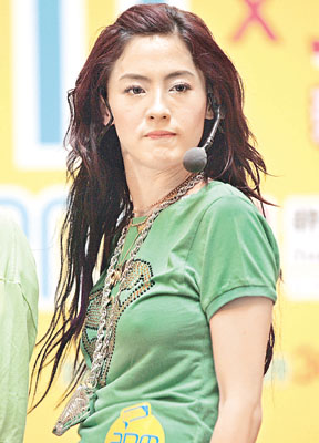 昨天柏芝穿上绿色T恤衬低腰裤作hip hop打扮,跳舞时却配上“特别效果”,胸前出现“凸点”现象之余,黑色内裤边也随着拍子频频曝光。柏芝更是语出惊人,在与fans跳舞时,她竟向fans说:“你用下面(下半身)顶住记者就得。”十分不文。当她唱《新闻女王》时,有人假扮狗仔队偷拍她,柏芝就用屁股把他顶开。
