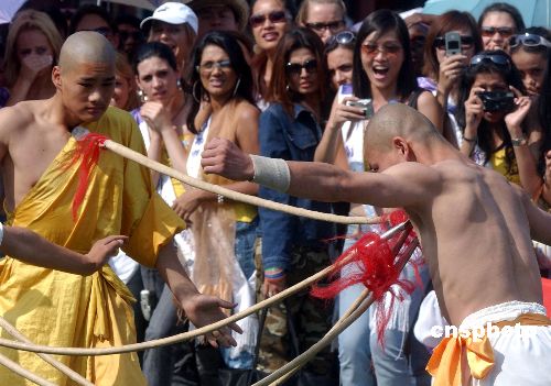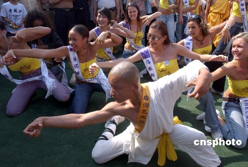 6月12日下午,来自世界各地的2005国际旅游小姐来到郑州境内的登封少林寺,感受了一下中国功夫的魄力,尖叫、赞叹、惊奇、神秘,少林寺迷住了她们。作者:马健