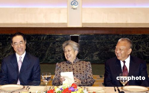 6月13日,国家副总理吴仪与全国政协副主席董建华(右)及香港署理行政长官唐英年(左)出席太平洋地区经济理事会开幕主题演讲午餐宴会。作者:洪少葵