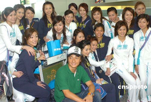 香港歌星方力申13日“率领”20位候选港姐乘坐斯里兰卡航空公司航班奔赴马尔代夫﹑斯里兰卡﹑泰国拍摄外景﹐在香港机场与候选港姐合影。作者:赵振清