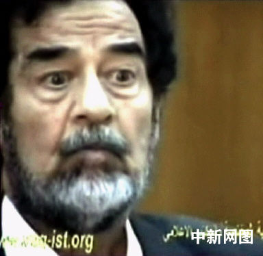 6月13日公布的伊拉克前总统萨达姆在一不明地点接受质询的电视照片。伊拉克特别法庭表示,一名法官已向萨达姆提出质询,调查一什叶派穆斯林聚居的村庄里数十名男子被杀害事件。1982年,萨达姆曾在该村逃过一次暗杀。