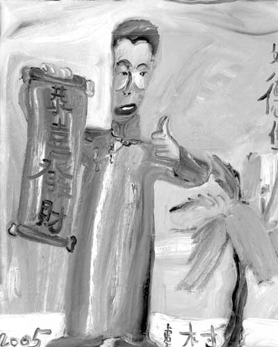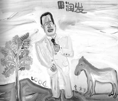 “周润发”看上去竟然像个日本人;“姚明”的脑袋和身子几乎一样长;“容祖儿”一只眼睛大,一只眼睛小,张着一张血红色、与面部不相称的大嘴;“刘德华”的脑袋是歪的。而所有人物的比例完全失调,表现的笔触完全放在了脸部,身子、腿完全像是嫁接的。