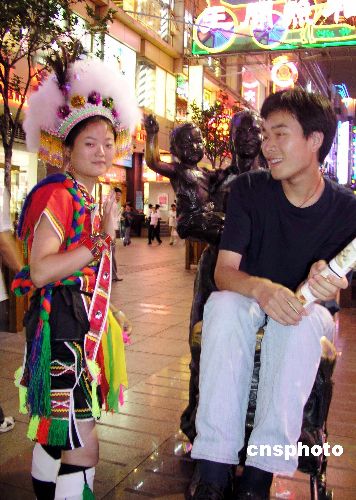 6月中旬,上海南京路步行街上台湾风味饮食店里的高山族员工,工余或工作间隙,常在步行街上休憩,姑娘们装束美丽,成为街头看点。游客市民纷纷与高山族姑娘合影留念。作者:蒋振雄