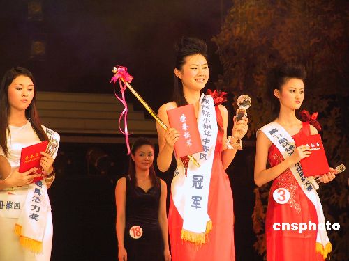 6月15日下午,第34届2005年环球洲际小姐大赛中国华中赛区总决赛在湖南举行,来自湖北的选手魏巍(中)获得冠军。据悉,“环球洲际小姐国际大赛”起始于1970年,至今有2位中国佳丽进入前三名。今年的中国赛区总决赛将于6月28日在长沙举行。作者:刘双双