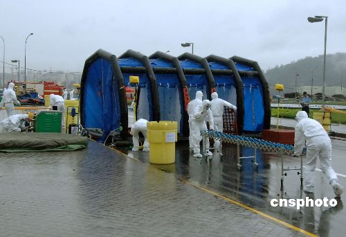 一刻钟后,新支起的红色帐篷下,治安警察指挥中心开始下达指令:“飞虎队”进场控制匪徒;谈判专家与匪徒对话解救“人质”;消防防化队伍建立防生化验伤分类区;卫生部门设立护理区。司法警察局的紧急应变区高速运作。飞虎队员以迅雷不及掩耳之势制服匪徒、救出人质,现场观众得到有序疏散。