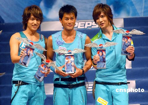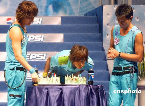 中新网6月17日电 据香港媒体报道,古天乐、言承旭(Jerry)及周渝民(仔仔),前晚一身蓝色装扮,出席《百事蓝色风暴615公告首部曲》记者会,吸引了五百歌迷捧场,场面热闹。由于仔仔上周四生日,古仔及Jerry特别送上蛋糕庆祝,Jerry更当场飞擒咬吻仔仔。至于仔仔的生日愿望,则是身体健康、支持F4、古天乐及百事。