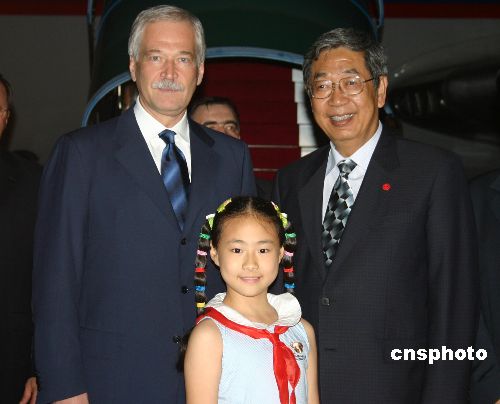 六月十七日,俄罗斯国家杜马主席格雷兹洛夫一行二十三人抵达重庆江北国际机场,开始在渝访问。图为中国全国人大常委会副委员长许嘉璐(右一)在重庆机场迎接格雷兹洛夫(左一)。作者:郭晋嘉