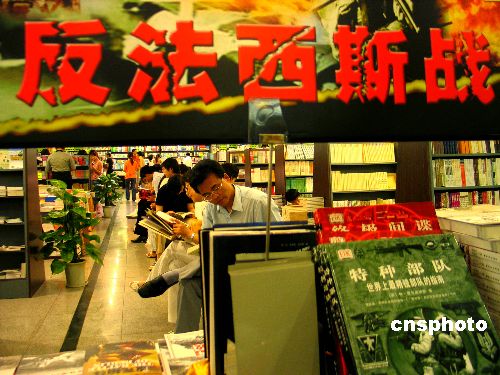 6月18日,南京某书城为纪念中国抗日战争暨世界反法西斯战争胜利60周年,在店堂内设立了反法西斯战争主题书展,受到读者欢迎,每天都吸引百余位读者。作者:钟山