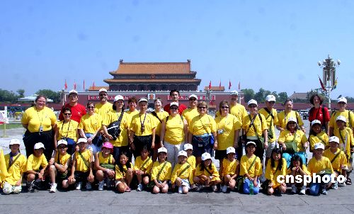 六月二十日,第二期“美国人领养中国儿童夏令营”的三十九人,其中成人二十名,儿童十九名来到北京天安门广场参观并合营留念。本次夏令营为期十三天,活动期间营员将访问北京、西安、上海等城市。作者:张勤