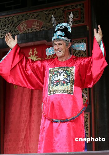 六月二十一日,前中国足球队主教练米卢蒂诺维奇来到中国著名水乡周庄参观游览,并穿起戏装登台做秀。作者:毛建军