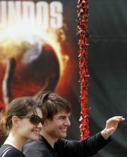 影星汤姆克鲁斯(Tom Cruise)6月21日与订婚女友凯蒂荷姆斯(Katie Holmes,左)一同出席电影《世界大战》(又译强战世界,War of the Worlds)在马德里的首映会,该片将自6月29日上映。阿汤哥于17日选在浪漫的巴黎艾菲尔铁塔向凯蒂求婚,结束外界对两人是否有意结婚的臆测。(图片来源:路透社 记者:Susana Vera )