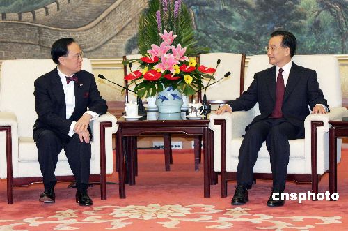今天上午九时十五分许,在人民大会堂香港厅简单隆重的宣誓就职仪式结束后,温家宝总理在接待厅会见了曾荫权。